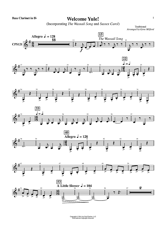 Digital Sheet Music for Welcome Yule! - Bass Clarinet in Bb by Traditional, Gene Milford scored for Concert Band; id:420330