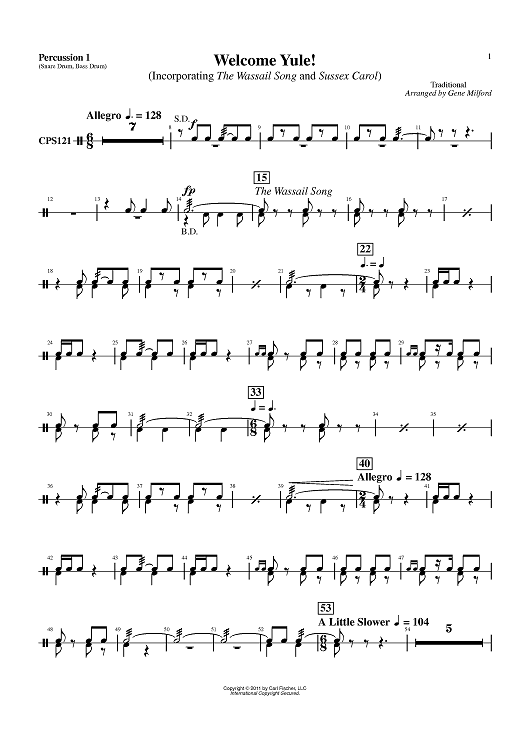 Digital Sheet Music for Welcome Yule! - Percussion 1 by Traditional, Gene Milford scored for Concert Band; id:420347