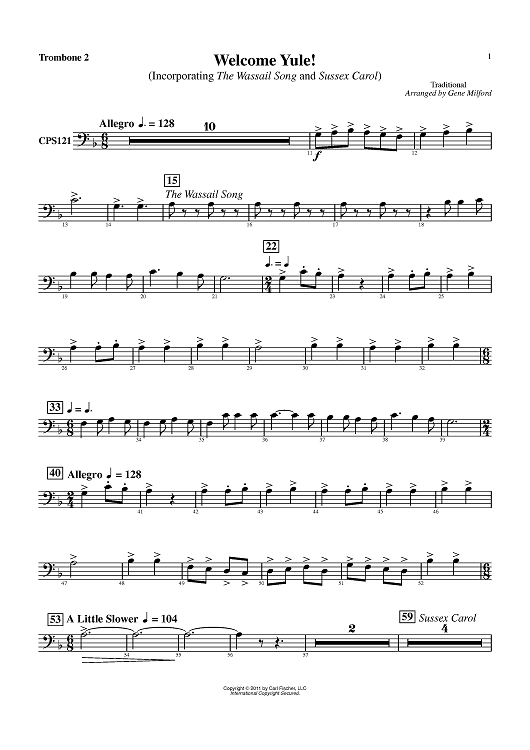 Digital Sheet Music for Welcome Yule! - Trombone 2 by Traditional, Gene Milford scored for Concert Band; id:420342