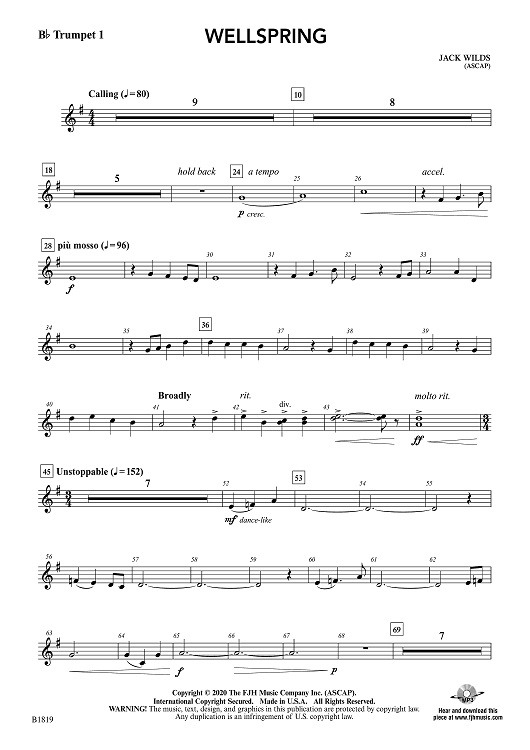 Digital Sheet Music for Wellspring - Bb Trumpet 1 by Jack Wilds scored for Concert Band; id:508493