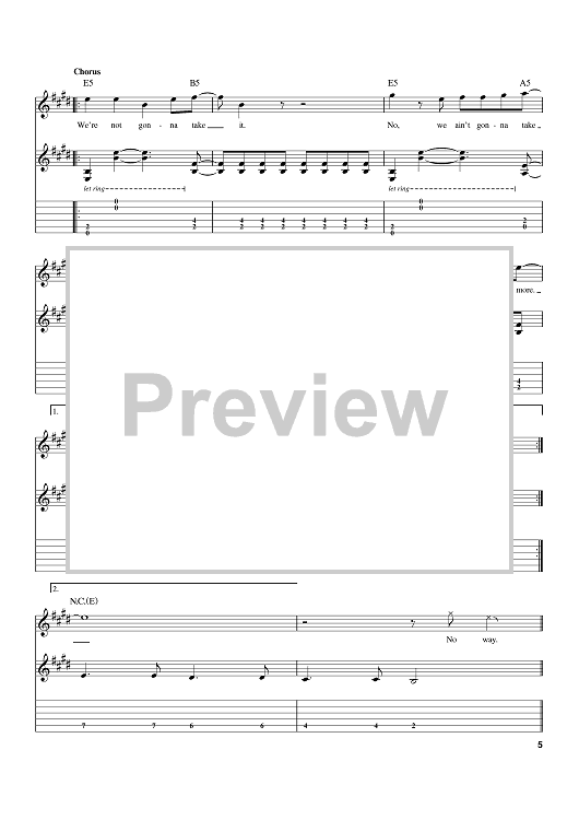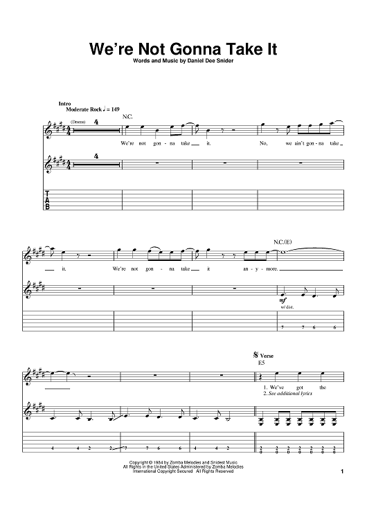 Digital Sheet Music for We're Not Gonna Take It by Daniel Dee Snider, Twisted Sister scored for Guitar Tab; id:402585
