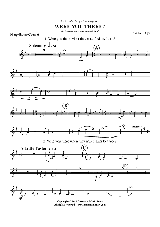 Digital Sheet Music for Were You There? - Variations on an American Spiritual - Flugelhorn/Cornet by John Jay Hilfiger, African American Spiritual scored for Brass Sextet; id:425235