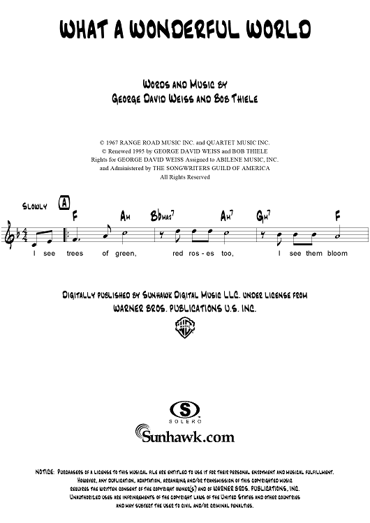 Digital Sheet Music for What a Wonderful World by Louis Armstrong, Bob Thiele, George David Weiss, Anne Murray, Eva Cassidy, Michael Buble, Kenny G scored for Lead Sheet; id:307530