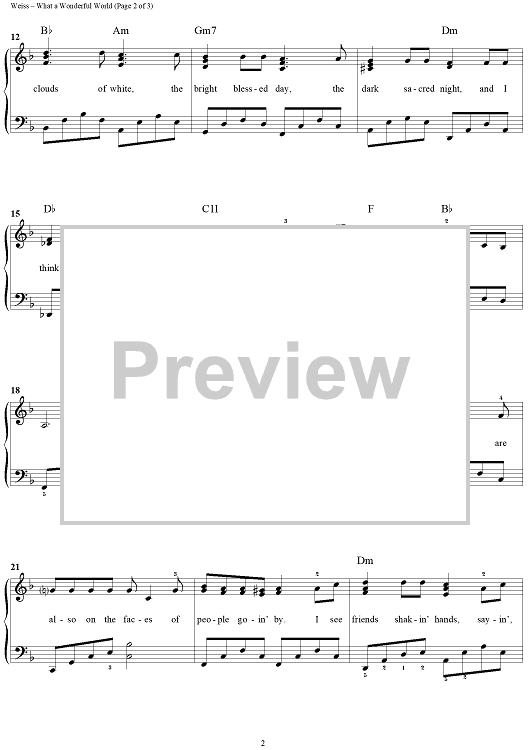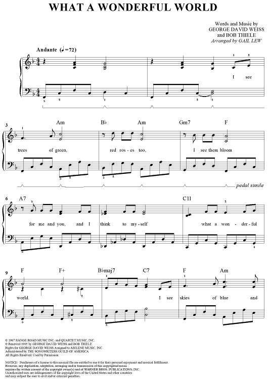 Digital Sheet Music for What a Wonderful World by Louis Armstrong, Bob Thiele, George David Weiss, Anne Murray, Gail Lew, Eva Cassidy, Michael Buble, Kenny G scored for Easy Piano/Vocal; id:317653