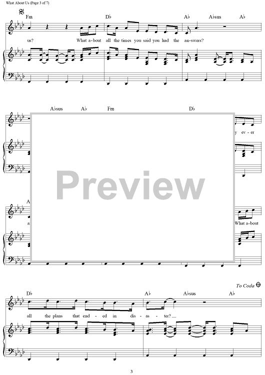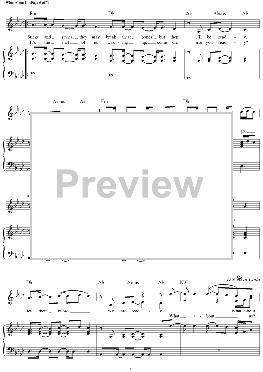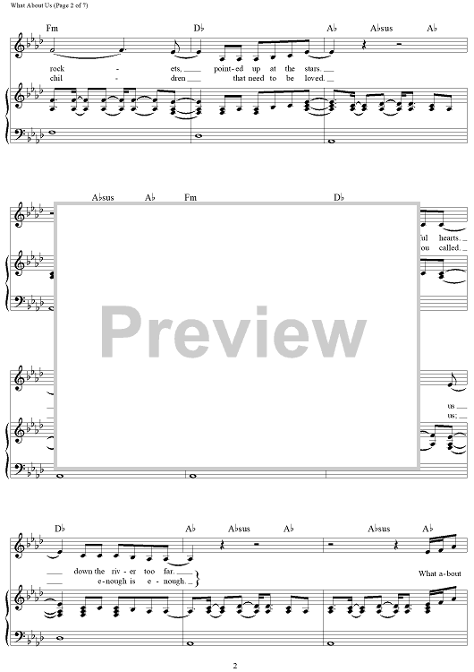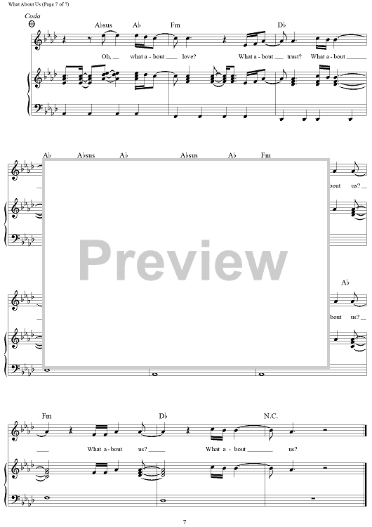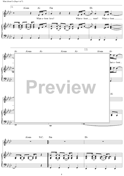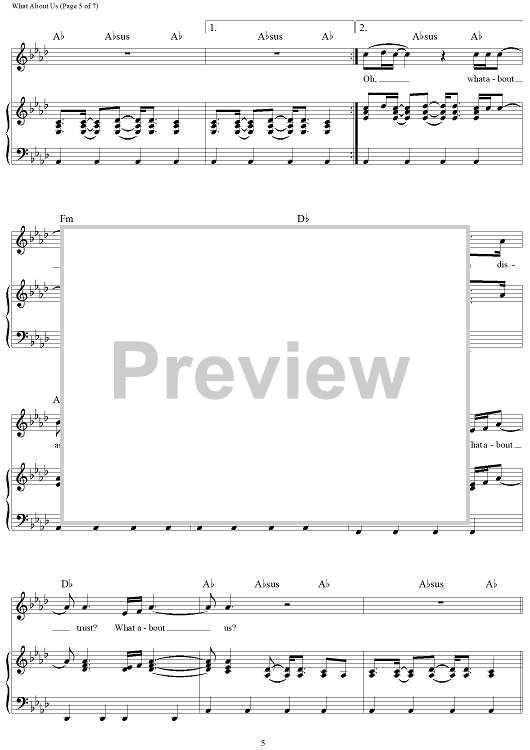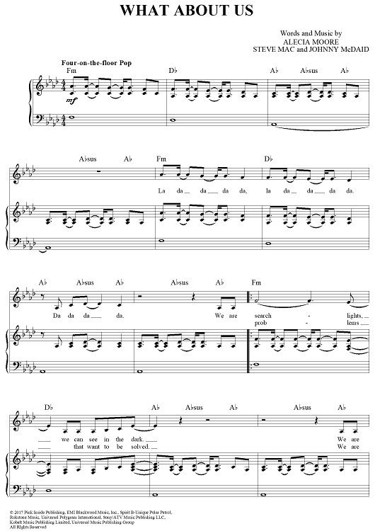 Digital Sheet Music for What About Us by Steve Mac, P!nk, Pink, John McDaid scored for Piano/Vocal/Chords; id:465515