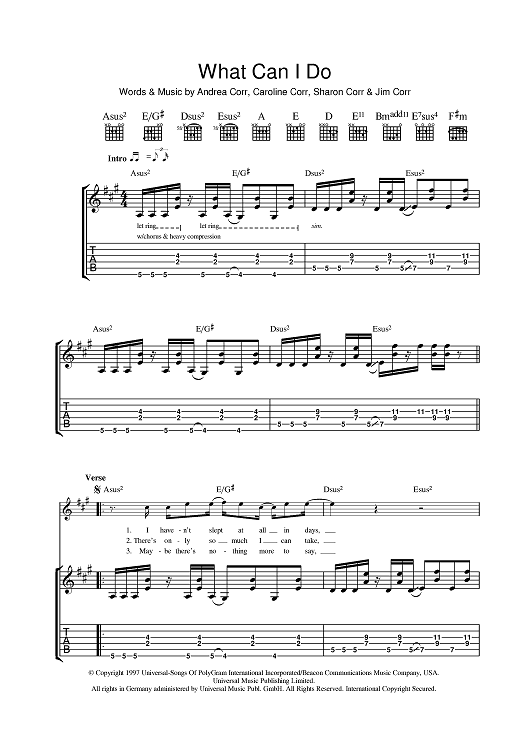 Digital Sheet Music for What Can I Do by The Corrs, Sharon Corr, Caroline Corr, Andrea Corr, Jim Corr scored for Guitar Tab; id:401342
