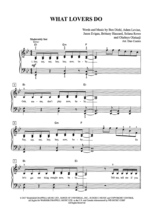 Digital Sheet Music for What Lovers Do by Dan Coates, Adam Levine, Maroon 5, Jason Evigan, Brittany Hazzard, SZA, Oladayo Olatunji, Ben Diehl scored for Easy Piano/Vocal/Chords; id:466824