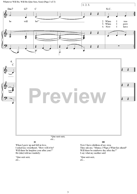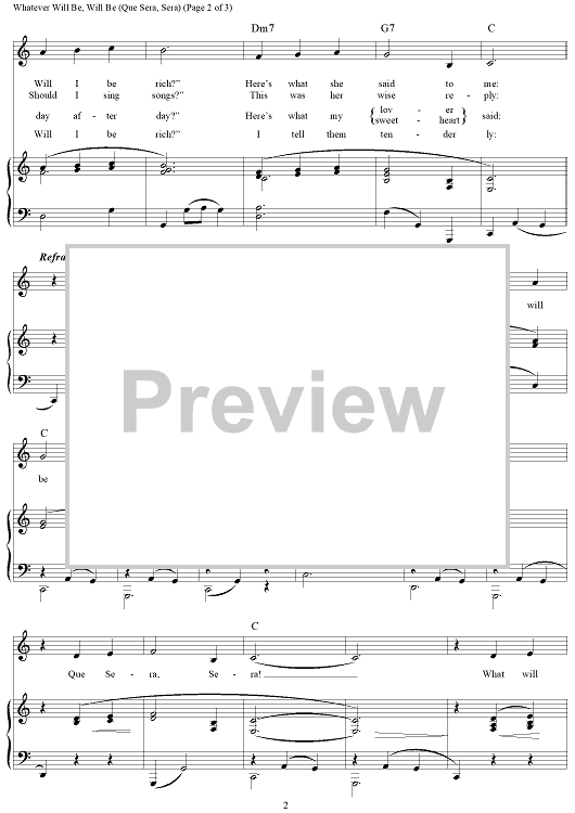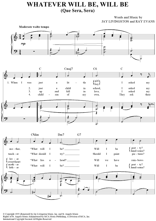 Digital Sheet Music for Whatever Will Be, Will Be (Que Sera, Sera) by Jay Livingston, Ray Evans, Doris Day, Sly and the Family Stone scored for Piano/Vocal/Chords; id:110077