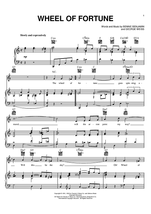 Digital Sheet Music for Wheel Of Fortune by George Weiss, Kay Starr, Bennie Benjamin scored for Piano/Vocal/Chords; id:384470