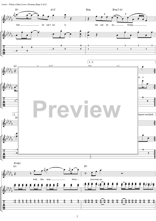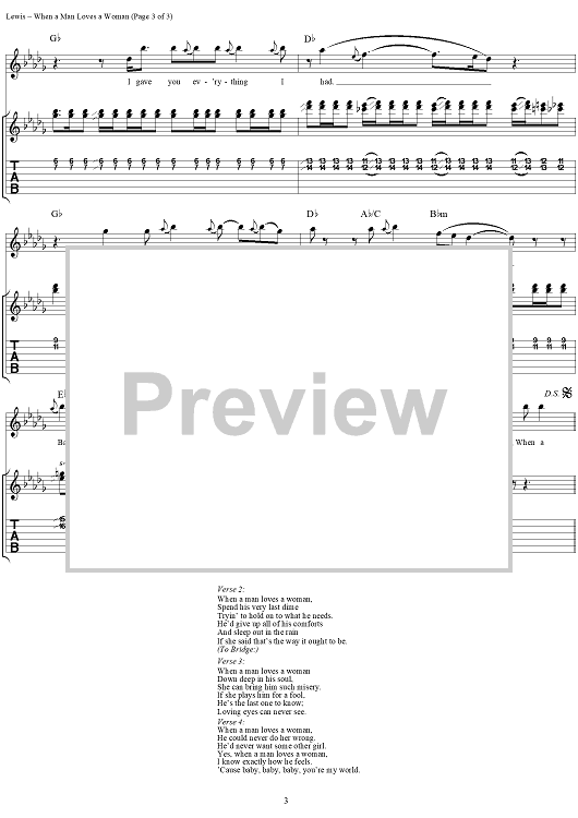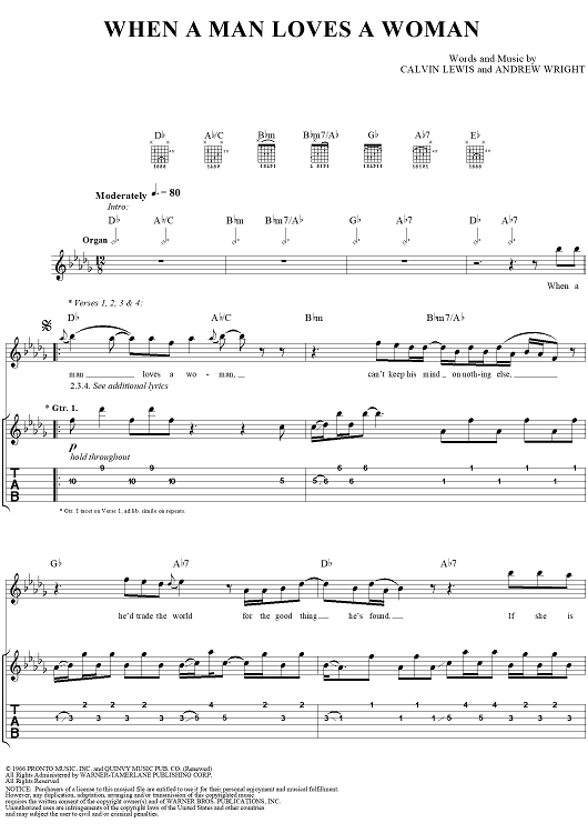 Digital Sheet Music for When A Man Loves A Woman by Calvin Lewis, Andrew Wright, Percy Sledge, Kenn Chipkin scored for Guitar Tab/Vocal; id:131714