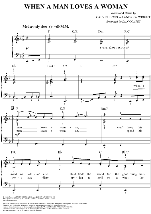 Digital Sheet Music for When a Man Loves a Woman by Dan Coates, Michael Bolton, Calvin Lewis, Andrew Wright scored for Easy Piano/Vocal; id:292420