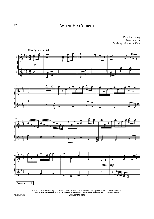 Digital Sheet Music for When He Cometh by George F. Root, Priscilla J. King scored for Piano Solo; id:434429