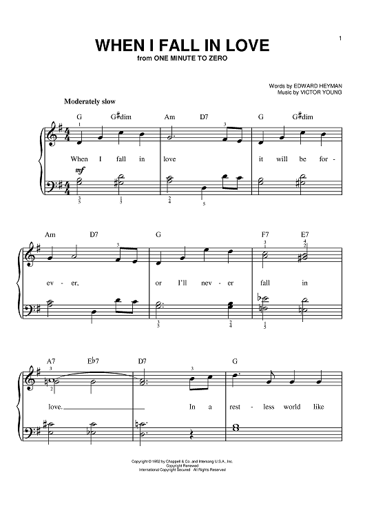 Digital Sheet Music for When I Fall In Love by Celine Dion, Nat King Cole, Kenny Rogers, Victor Young, Edward Heyman, The Lettermen, Marilyn Monroe, Julie London scored for Easy Piano; id:375170