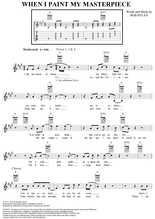 Digital Sheet Music for When I Paint My Masterpiece by Bob Dylan, Jerry Garcia scored for Easy Guitar Tab/Vocal; id:291742