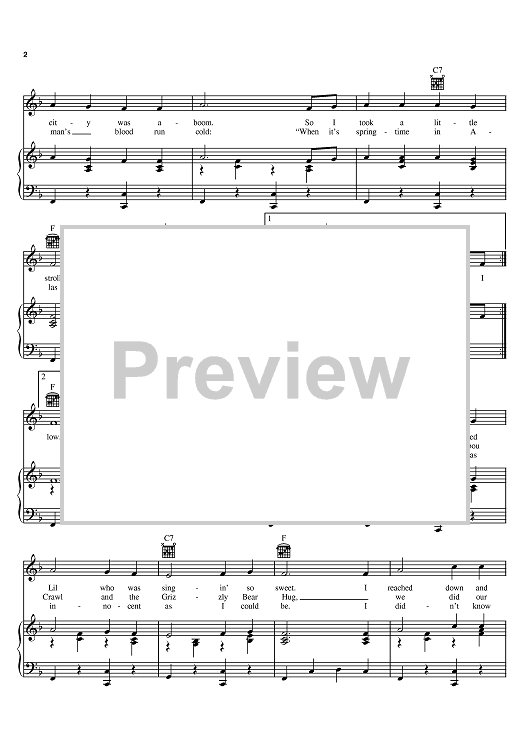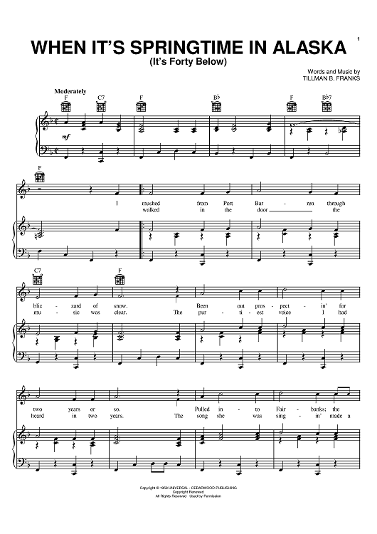 Digital Sheet Music for When It's Springtime In Alaska (It's Forty Below) by Johnny Horton, Tillman Franks scored for Piano/Vocal/Chords; id:388253