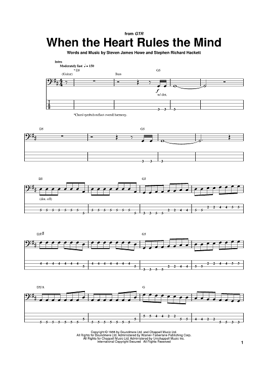 Digital Sheet Music for When The Heart Rules The Mind by Steve Howe, Steve Hackett, GTR scored for Bass Tab; id:383056