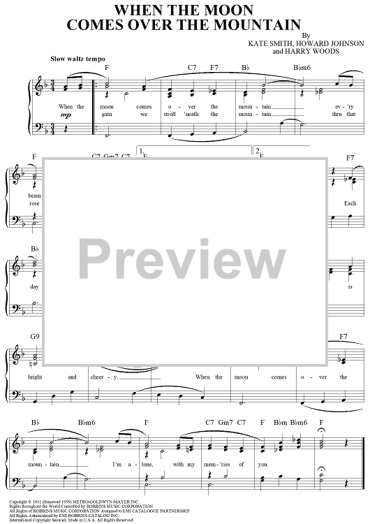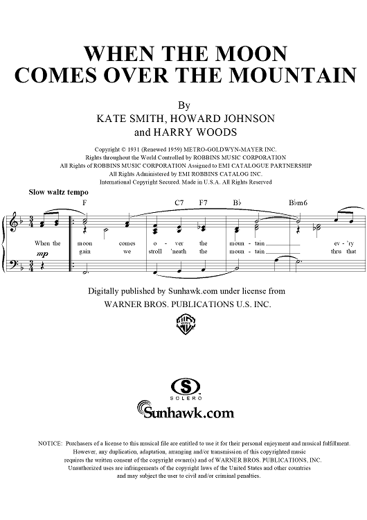 Digital Sheet Music for When the Moon Comes Over the Mountain by Harry Woods, Kate Smith, Howard Johnson scored for Piano/Vocal/Chords; id:220557