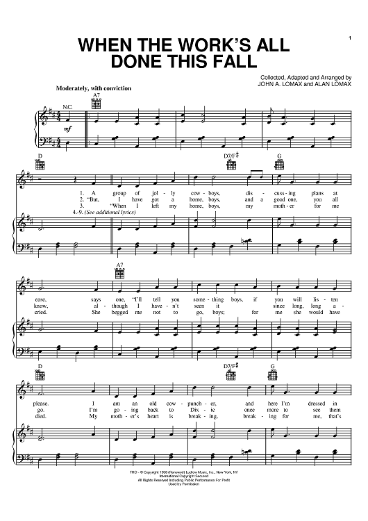 Digital Sheet Music for When The Work's All Done This Fall by John A. Lomax, Alan Lomax scored for Piano/Vocal/Chords; id:381392