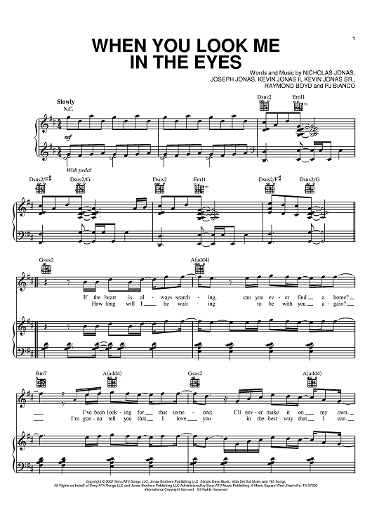 Digital Sheet Music for When You Look Me In The Eyes by Nicholas Jonas, Joseph Jonas, Kevin Jonas II, Jonas Brothers, PJ Bianco, Raymond Boyd, Kevin Jonas Sr. scored for Piano/Vocal/Chords; id:402233