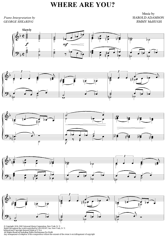 Digital Sheet Music for Where Are You? by George Shearing, Jimmy McHugh, Harold Adamson scored for Piano Solo; id:413144