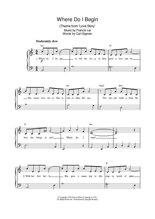 Digital Sheet Music for Where Do I Begin by Carl Sigman, Francis Lai scored for Piano; id:382466