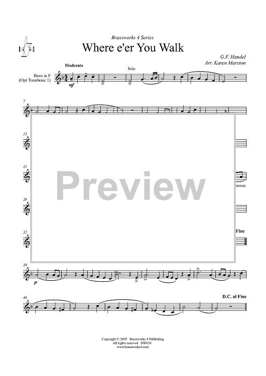 Digital Sheet Music for Where E’re You Walk - Horn in F by George Frideric Handel, Karen Marston scored for Brass Quartet; id:411311