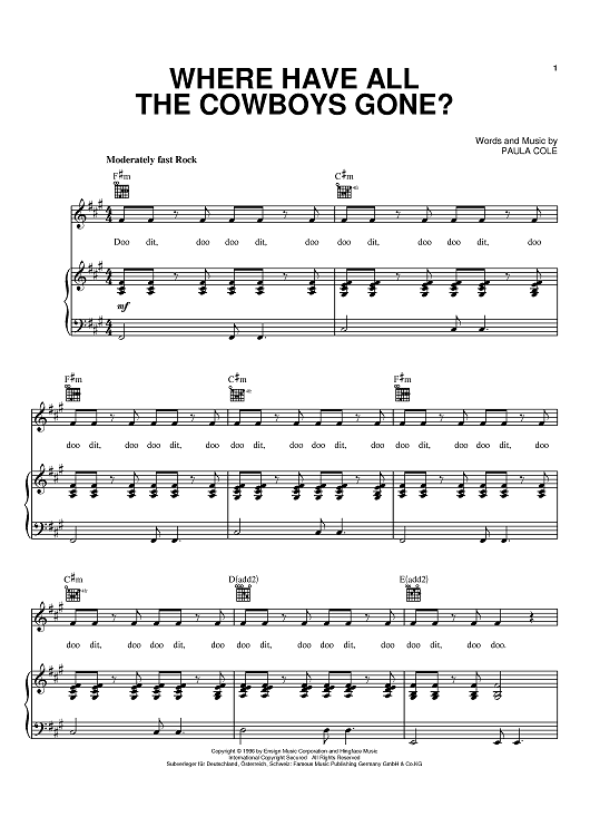 Digital Sheet Music for Where Have All The Cowboys Gone? by Cole Paula scored for Piano/Vocal/Chords; id:367998
