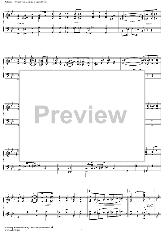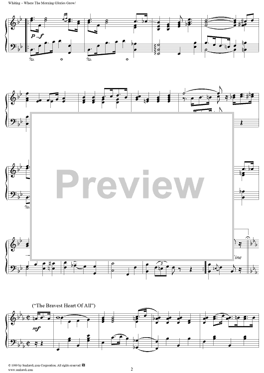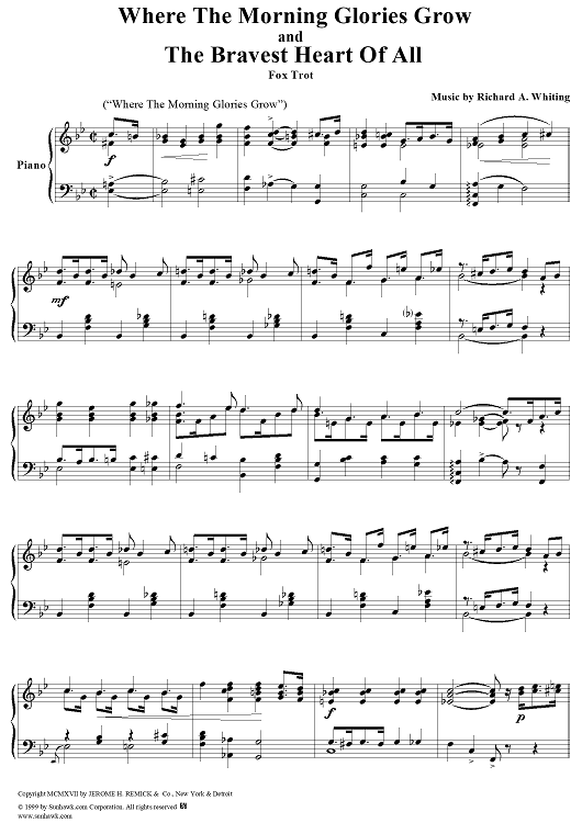 Digital Sheet Music for Where the morning glories grow / The Bravest heart of all medley (Fox Trots) by Richard A. Whiting scored for Piano/Vocal; id:264339