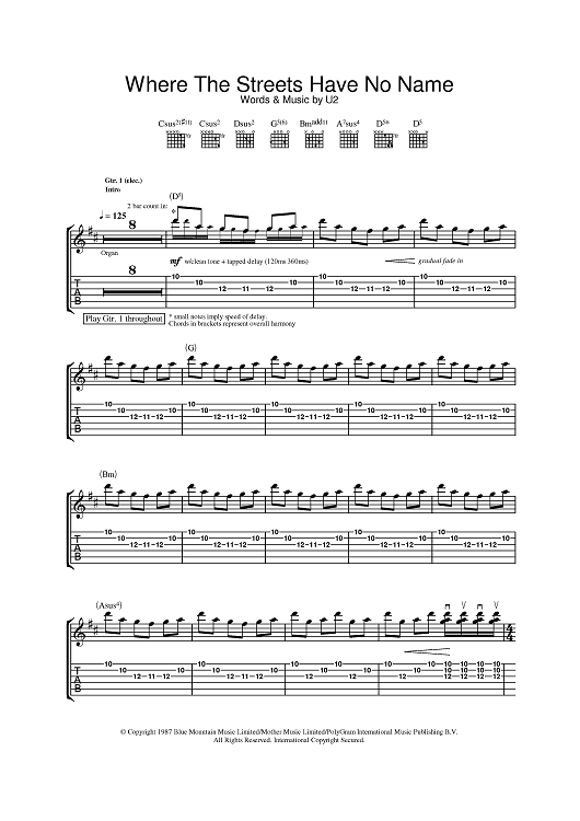Digital Sheet Music for Where The Streets Have No Name by U2 scored for Guitar Tab; id:381907