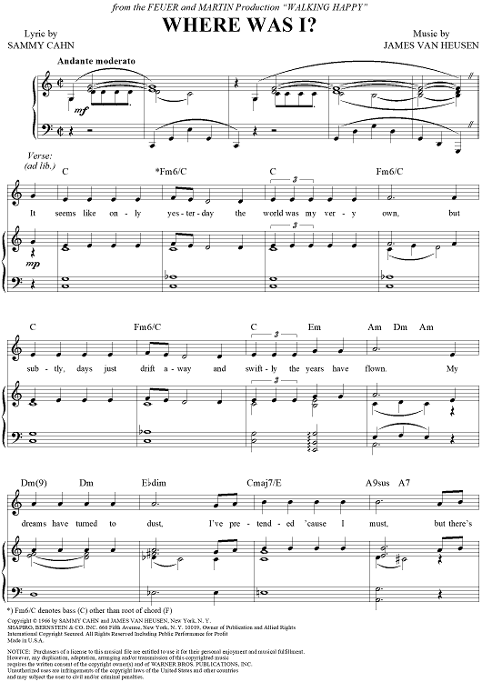 Digital Sheet Music for Where Was I? by Sammy Cahn, Jimmy Van Heusen scored for Piano/Vocal/Chords; id:355333