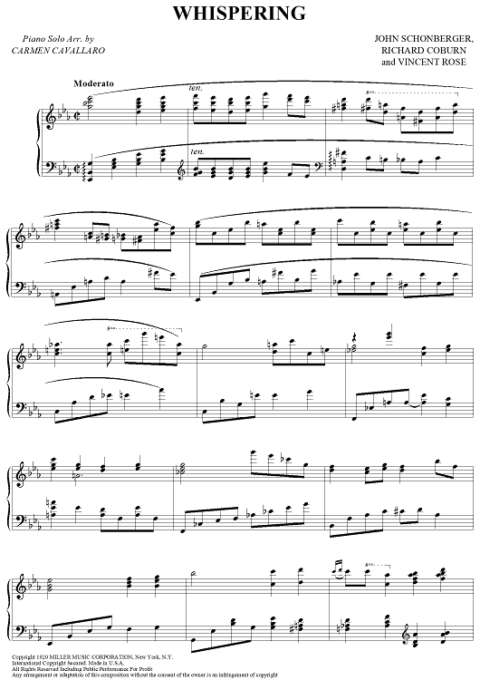 Digital Sheet Music for Whispering by Vincent Rose, Richard Coburn, John Schonberger, Carmen Cavallaro scored for Piano Solo; id:364996