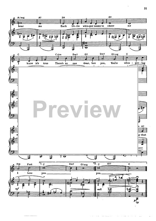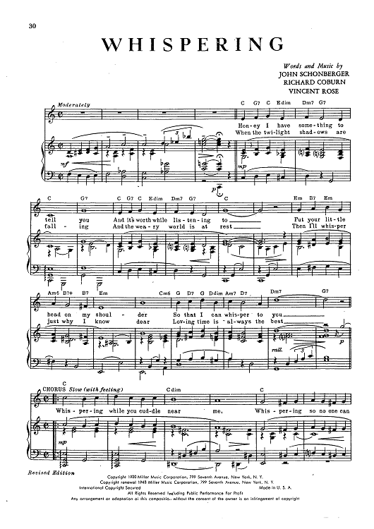 Digital Sheet Music for Whispering by Vincent Rose, Richard Coburn, John Schonberger, Dan Dailey scored for Piano/Vocal/Chords; id:423091