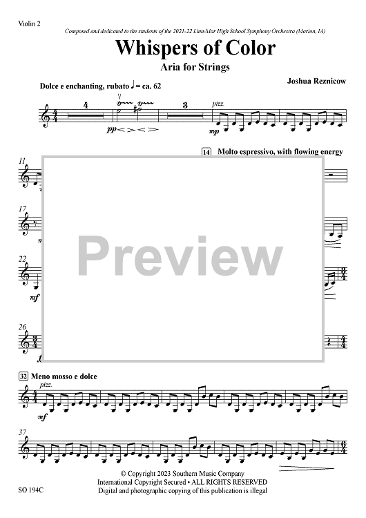 Digital Sheet Music for Whispers of Color: Aria for Strings - Violin 2 by Joshua Reznicow scored for String Orchestra; id:503177