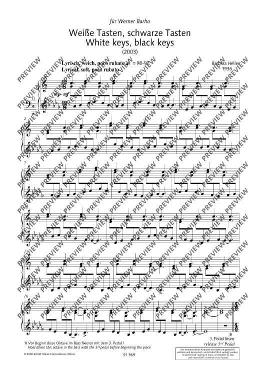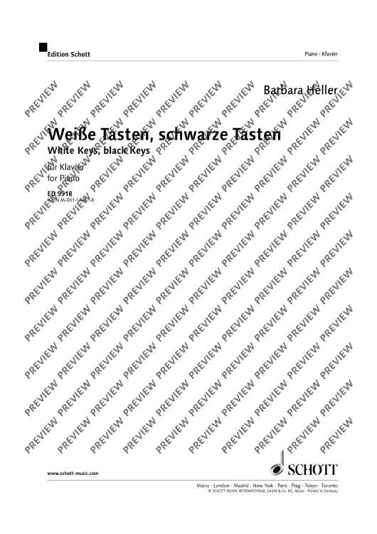 'White Keys - Black Keys' was written by Barbara Heller in December 2003 for a pianist who likes to improvise and loves a certain freedom in a work. Although an order of the parts is pre-determined in her composition, all sections may well be combined in a different order. The short chorale can be followed by a free improvisation which also makes use - ad libitum - of the playing in the strings.