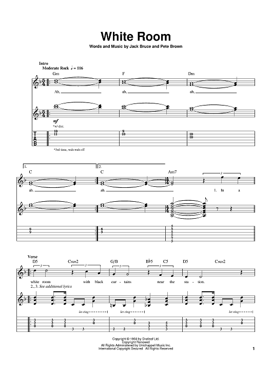 Digital Sheet Music for White Room by Eric Clapton, Cream, Pete Brown, Jack Bruce scored for Guitar Tab; id:380615