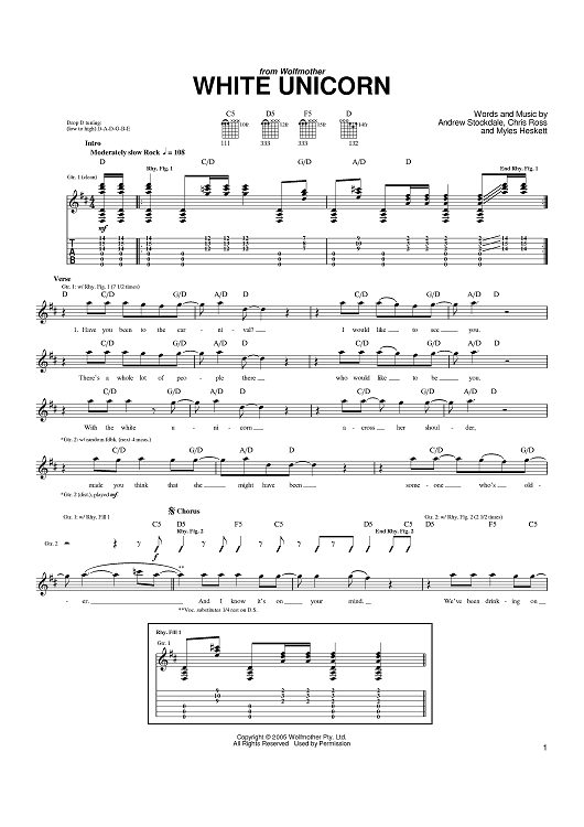 Digital Sheet Music for White Unicorn by Andrew Stockdale, Chris Ross, Myles Heskett, Wolfmother scored for Guitar Tab; id:393744