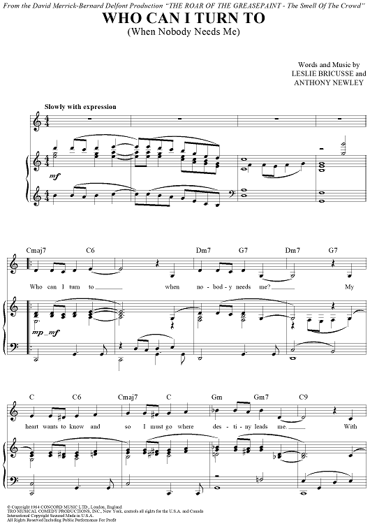"Who Can I Turn To (When Nobody Needs Me)" Sheet Music by Leslie Bricusse