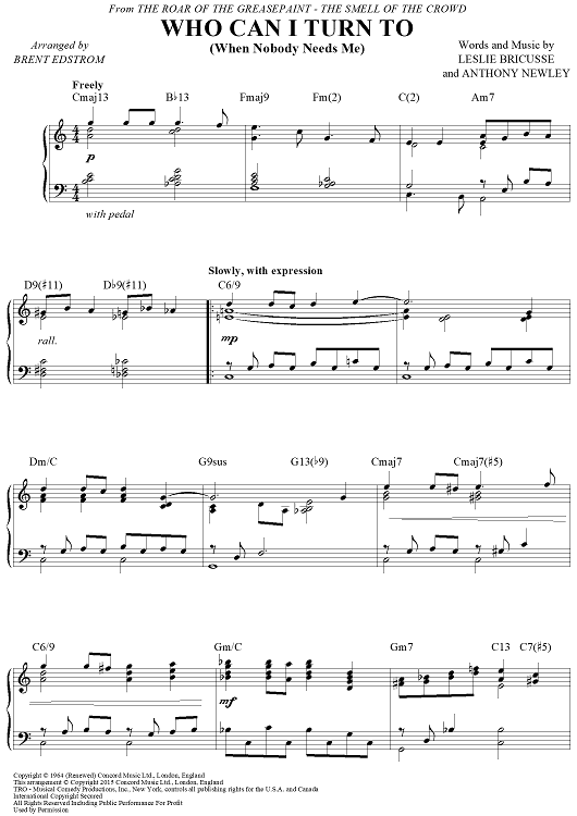 "Who Can I Turn To (When Nobody Needs Me)" Sheet Music by Leslie Bricusse