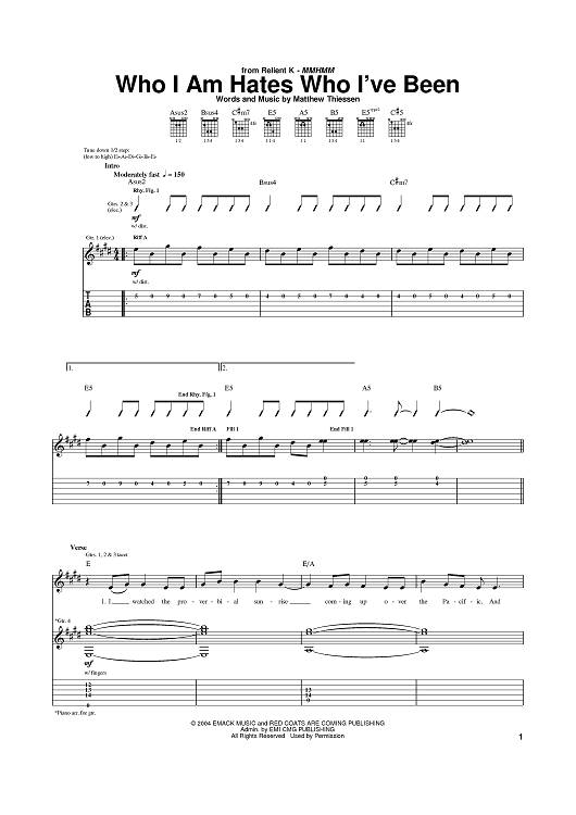 Digital Sheet Music for Who I Am Hates Who I've Been by Relient K, Matt Thiessen scored for Guitar Tab; id:384403