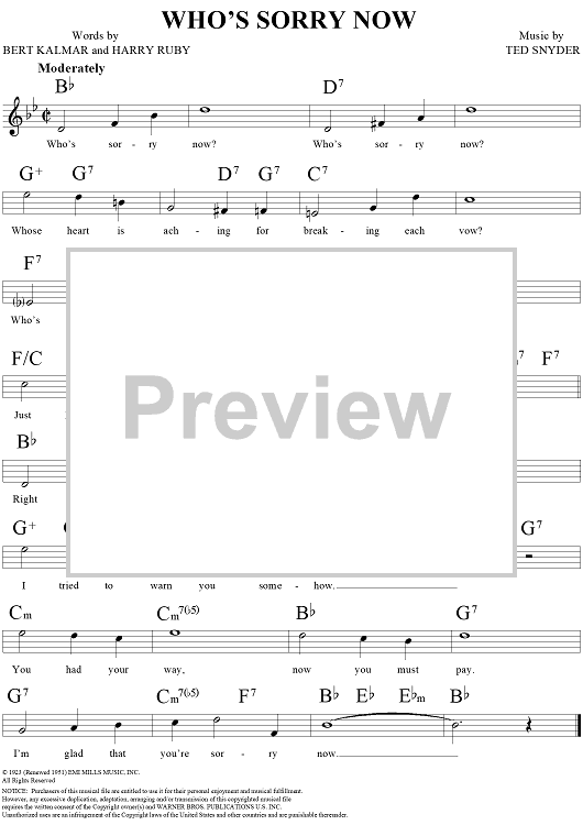 Digital Sheet Music for Who's Sorry Now by Ted Snyder, Bert Kalmar, Harry Ruby, Connie Francis, Gloria De Haven scored for Lead Sheet; id:109317