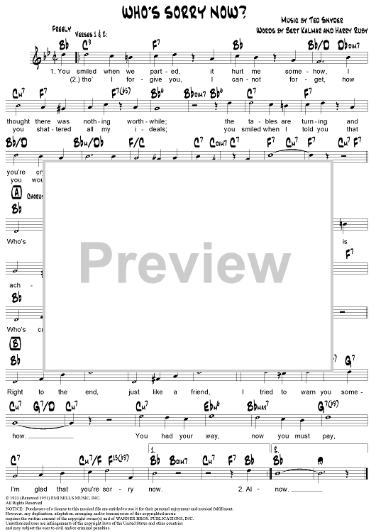 Digital Sheet Music for Who's Sorry Now? by Ted Snyder, Bert Kalmar, Harry Ruby, Connie Francis scored for Lead Sheet; id:315165