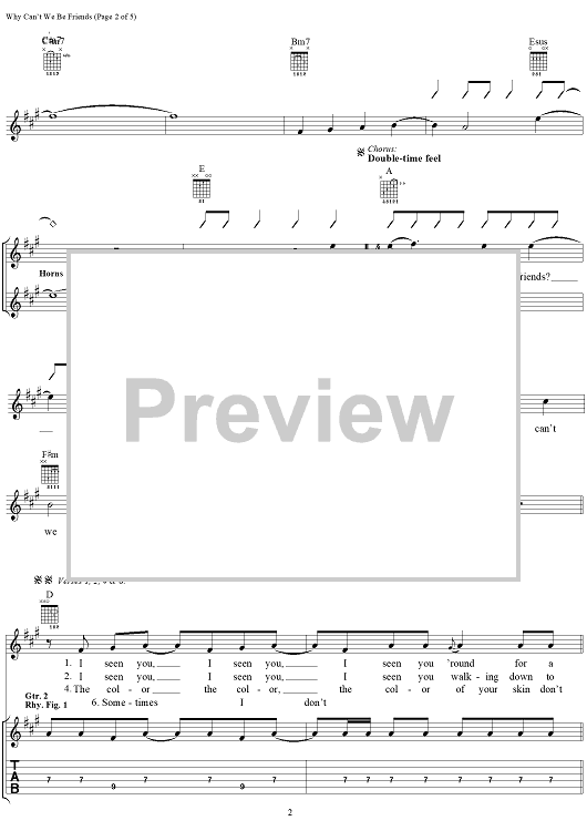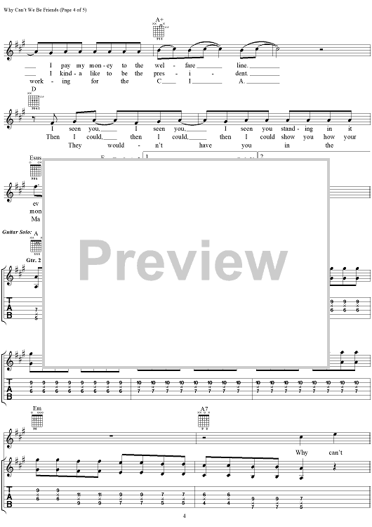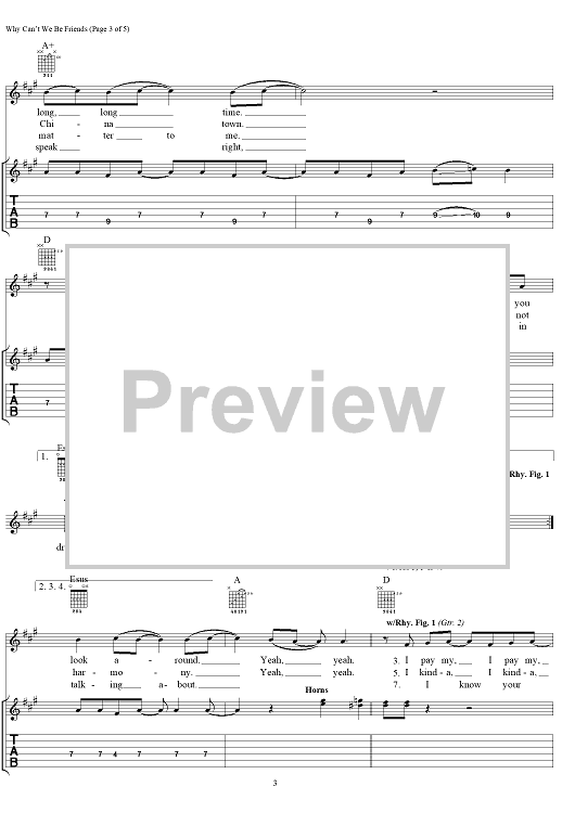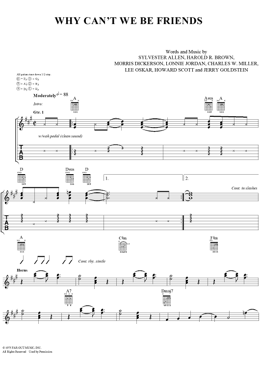 Digital Sheet Music for Why Can't We Be Friends by Sylvester Allen, Harold Ray Brown, B.B. Dickerson, Lonnie Jordan, Charles W. Miller, Lee Oskar, Howard Scott, Jerry Goldstein, War, Smash Mouth scored for Guitar Tab/Vocal; id:111663