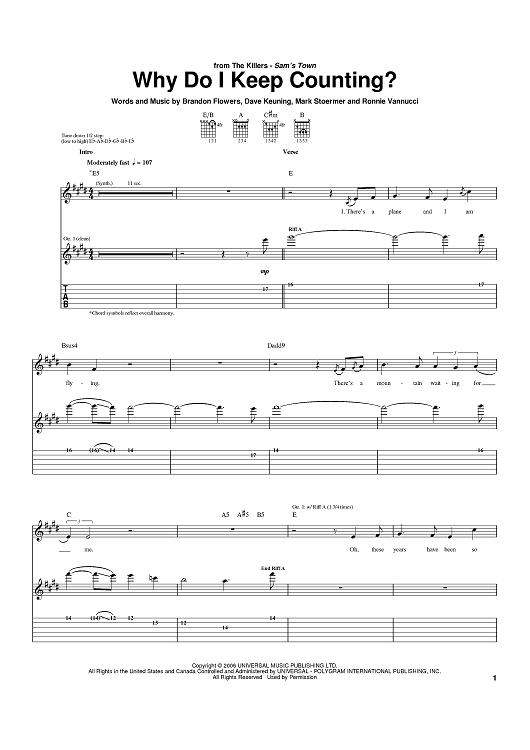 Digital Sheet Music for Why Do I Keep Counting? by Brandon Flowers, Dave Keuning, The Killers, Mark Stoermer, Ronnie Vannucci Jr. scored for Guitar Tab; id:397165