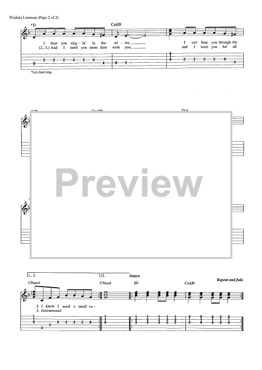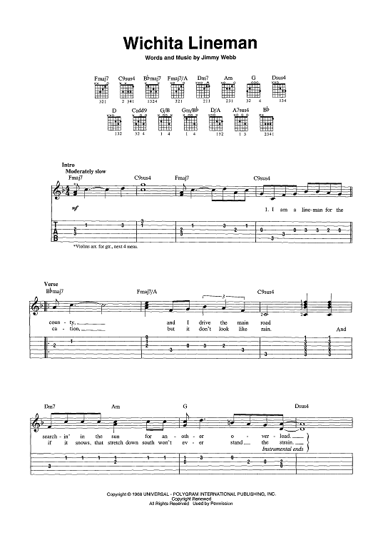 Digital Sheet Music for Wichita Lineman by Glen Campbell, Jimmy Webb scored for Easy Guitar Tab/Vocal/Chords; id:456844