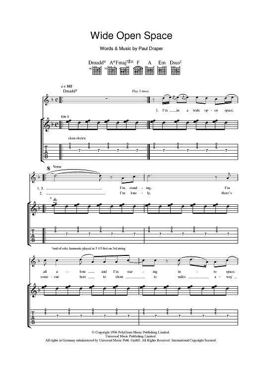 Digital Sheet Music for Wide Open Space by Paul Draper, Mansun scored for Guitar Tab; id:401337