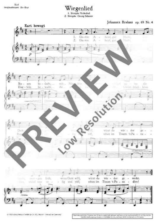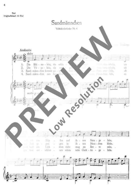 Digital Sheet Music for Wiegenlied / Sandmännchen in D major by Johannes Brahms scored for Low Voice And Piano; id:474925