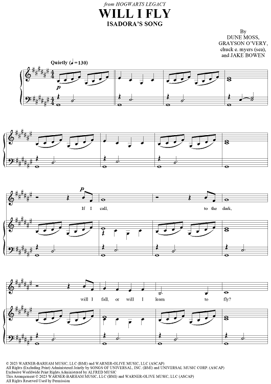 Digital Sheet Music for Will I Fly (Isidora's Song from Hogwart's Legacy) by Jake Bowen, Dune Moss, Grayson O'very, chuck e. myers (sea) scored for Piano/Vocal; id:501067