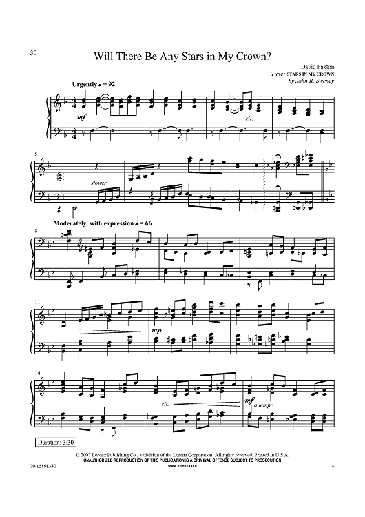 Digital Sheet Music for Will There Be Any Stars in My Crown? by John R. Sweney, David Paxton scored for Piano Solo; id:433567