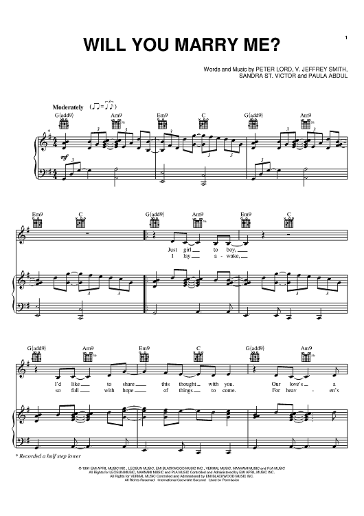 Digital Sheet Music for Will You Marry Me? by Paula Abdul, Peter Lord, V. Jeffrey Smith, Sandra St. Victor scored for Piano/Vocal/Chords; id:402577