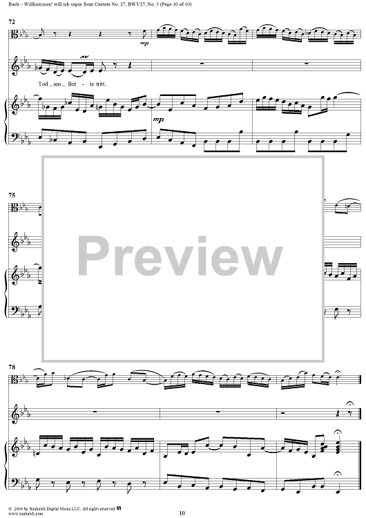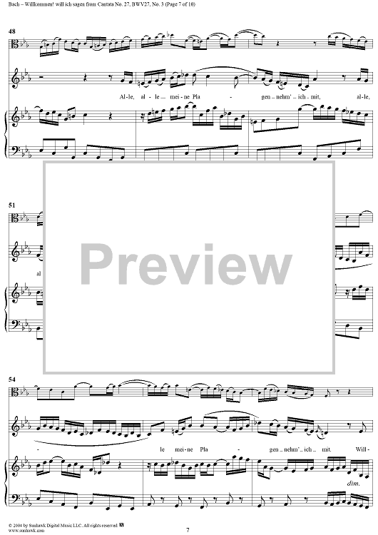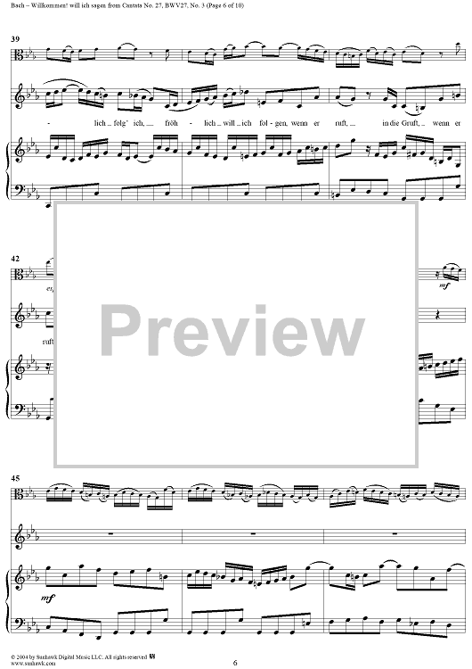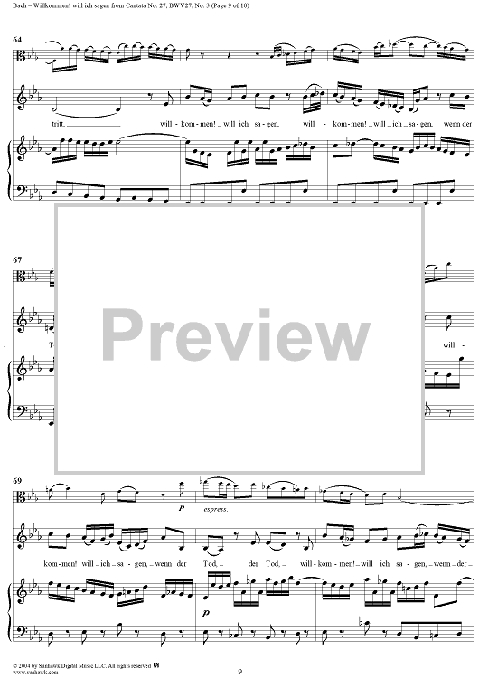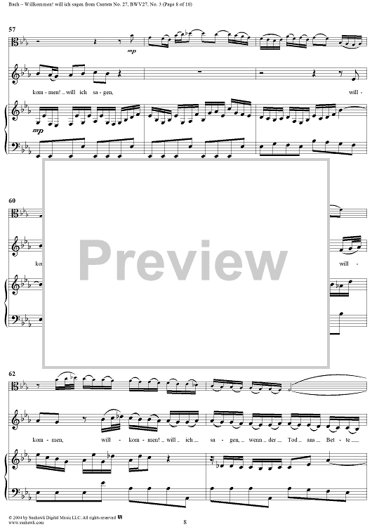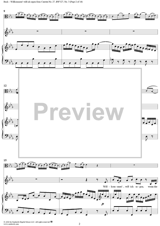 Digital Sheet Music for "Willkommen! will ich sagen," Aria, No. 3 from Cantata No. 27: Wer weiss, wie nahe mir mein Ende, BWV27 - Piano Score by Johann Sebastian Bach scored for Alto, English Horn and Piano or Organ; id:303626